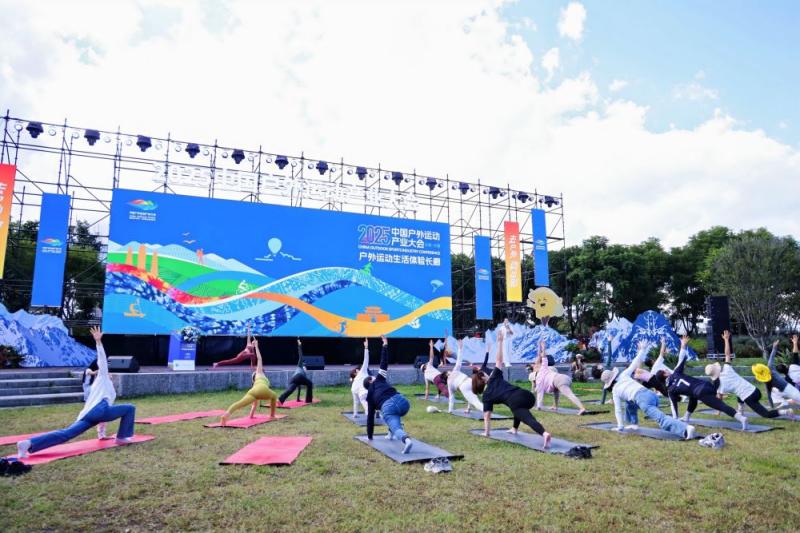 在2025中国户外运动产业大会户外运动生活体验长廊,人们在参与户外瑜伽活动