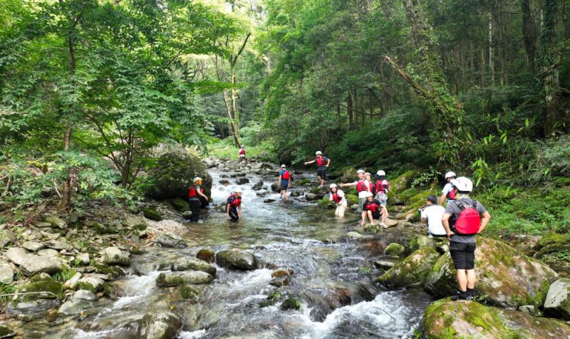 8月24日,游客在黄山市黟县五溪山风景区体验溯溪(无人机照片)。新华社发(汪澄 摄)