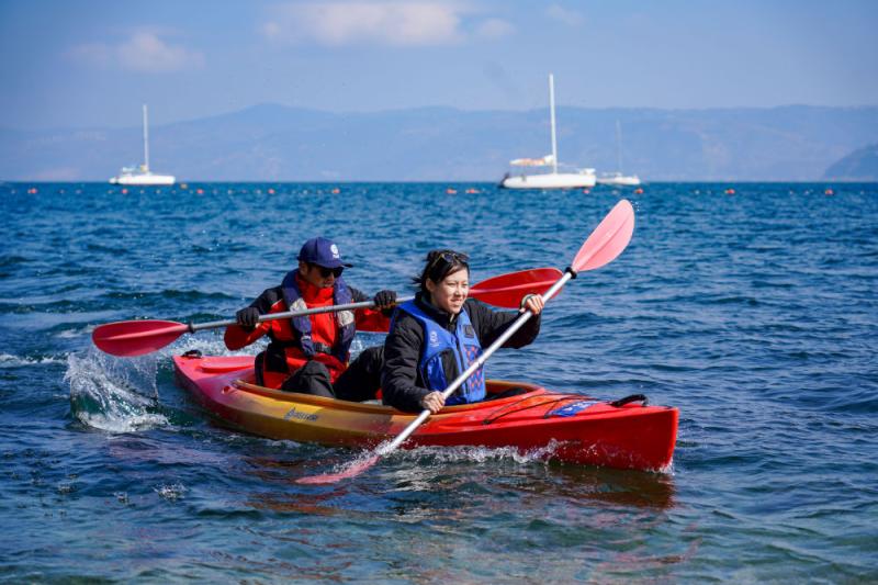 在云南省玉溪市抚仙湖,游客(右)在教练员带领下体验皮划艇。新华社记者 王静颐 摄