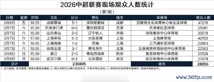 8场比赛现场观众人数总计为230845人,平均人数28856人,值得一提的是,武汉三镇现场观众人数较上赛季9880的平均数有了飞跃,而海港的上座率也比上赛季平均值高了近4000人。和上赛季对比,2025中超首轮比赛全部现场球迷为217392人,场均上座27174人,全年场均上座率则为25754人,2026赛季首轮数据无论较之全年同期还是全年平均都有一定提升。